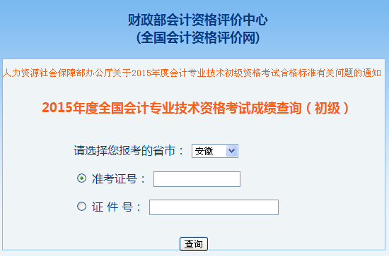 安徽2015年初級會計職稱成績查詢入口已開通,開通時間:6月9日,查詢網(wǎng)址:全國會計資格評價網(wǎng)http://kzp.mof.gov.cn/cjcx/cjcx1_n.jsp 或考生可點擊下列圖片進入查詢系統(tǒng)