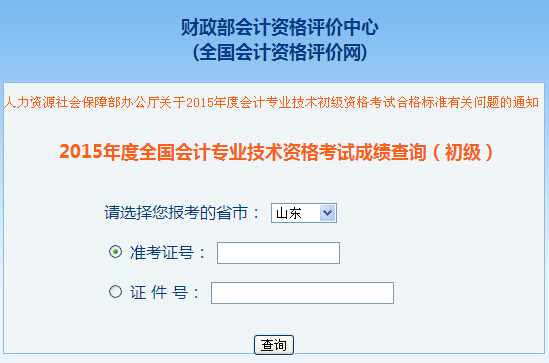 摘要 山東2015年初級會計職稱成績查詢入口 查詢網址:全國會計資格評價網http://kzp.mof.gov.cn/cjcx/cjcx1_n.jsp