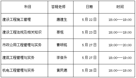 二級(jí)建造師考前最后的直播答疑時(shí)間安排已經(jīng)公布,請(qǐng)查看表格。