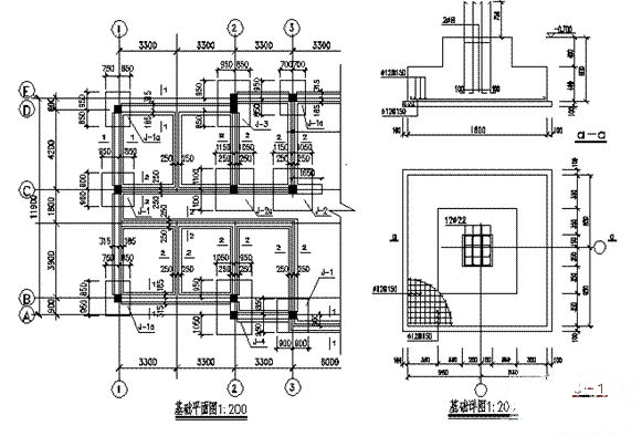 基礎(chǔ)詳圖主要表達(dá)基礎(chǔ)的形狀、尺寸、材料、構(gòu)造及基礎(chǔ)的埋置深度等。各種基礎(chǔ)的圖示方法有所不同,圖1-2-7舉出了獨(dú)立基礎(chǔ)的基礎(chǔ)詳圖。從該圖中看到,基礎(chǔ)底面長(zhǎng)度為1800mm,寬度為1800mm,基礎(chǔ)頂面標(biāo)高-0.700m,每個(gè)基礎(chǔ)大放腳的高度為400mm。在基礎(chǔ)底部雙向配有φ12@150的受力鋼筋?;A(chǔ)下有100mm厚的C10素混凝土墊層?;A(chǔ)柱尺寸為400mm×400mm,預(yù)留插筋12φ22 ,鋼筋下端直接插入基礎(chǔ)內(nèi)部,上端與柱中的鋼筋搭接。