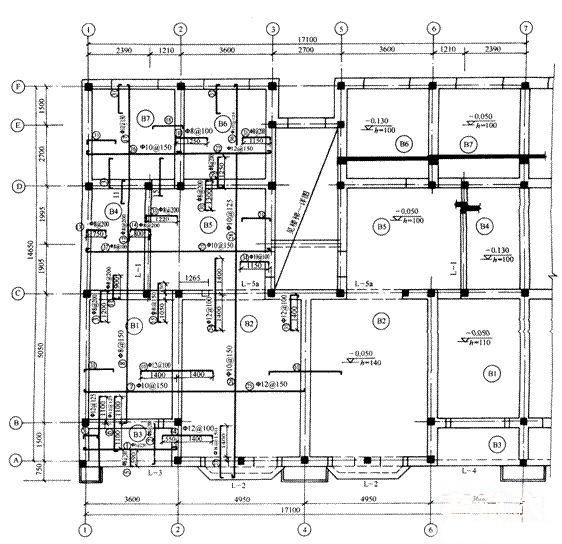 圖1-2-8是某住宅單元地下室頂板結構平面圖。本住宅有兩個單元,因兩個單元結構形式一樣,配筋相同,所以只畫一個單元。繪圖比例l:50,圖上被剖切到的構造柱被涂黑。板下梁在相應位置上注出(如L-l、L-2等),樓板按相同配筋、尺寸、板厚等條件分成7種板,用圓圈加編號的形式標出,樓板配筋用粗線按規(guī)定畫法畫出,一種板只畫一塊。因每塊板的板厚、標高不盡相同,所以需要一一標出,并在高低變化處畫出了重合斷面圖。樓梯間因習慣上需另畫詳圖,這里僅畫一條對角線并標注說明。樓梯結構圖的詳解單獨說明。