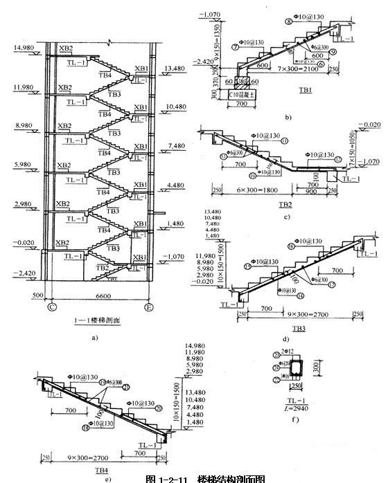 圖1-2-11a所示是l―l樓梯剖面,主要表示了TB、TL、XB在豎向的位置、標(biāo)高,結(jié)構(gòu)情況。由圖中看出TBl、TB2各一塊,TB3、TB4各5塊。TL1 12根,各構(gòu)件在空間的位置一目了然。圖1-2-11b、圖1-2-11c、圖1-2-11d、圖1-2-11e分別為TBl、TB2、TB3、TB4的剖畫圖;圖1-2-11f為平臺梁TL―l的剖面圖。從圖1-2-11b可以看出,從地下室-2.420m到-1.070m共有9步,每步高150mm;踏步板厚80mm并與平臺梁TL-l直接相連,梯板中的配筋⑥φ10@130為縱向受力筋,布置在板底;⑨號分布筋橫向布在受力筋上面,⑦⑧號為構(gòu)造筋,布置在板兩端的上方,兩端深入平臺梁內(nèi)。TB2、TB3、TB4的構(gòu)造形式與TBl基本相同,不同之處是踏步板厚改為100mm,TB2為折板。圖1-2-11f為平臺梁TL―l斷面圖,梁寬250mm,梁高300mm,長2940mm,左右兩側(cè)分別與踏步板、平臺梁相連,它的標(biāo)高見1―1樓梯剖面圖,梁中受力筋22為3φ16,架力筋23為2φ12,箍筋φ6@200。