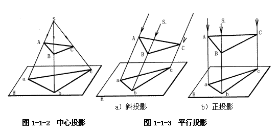 當(dāng)投影中心S在有限的距離內(nèi),所有的投射線都交匯于一點(diǎn),這種方法所產(chǎn)生的投影,稱為中心投影,如圖1-1-2所示。