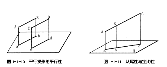 當(dāng)空間兩直線互相平行時(shí),它們?cè)谕煌队懊嫔系耐队叭曰ハ嗥叫?。如圖1-1-10所示,空間兩直線AB//CD,則平面ABba//平面CDdc,兩平面與投影面H的交線ab、cd必互相平行。平行投影的這種性質(zhì)稱(chēng)為平行性。