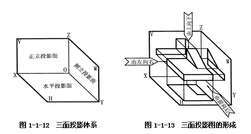 為了使正投影圖能唯一確定較復(fù)雜物體的形狀,我們?cè)O(shè)立了三個(gè)互相垂直的平面作為投影面,組成一個(gè)三面投影體系,如圖1-1-12所示。水平投影面用H標(biāo)記,簡稱水平面或H面;正立投影面用V標(biāo)記,簡稱正立面或V面;側(cè)立投影面用W標(biāo)記,簡稱側(cè)面或W面。兩投影面的交線稱為投影軸。H面與V面的交線為OX軸,H面與W面的交線為OY軸,V面與W面的交線為OZ軸,它們也互相垂直,并交匯于原點(diǎn)O。