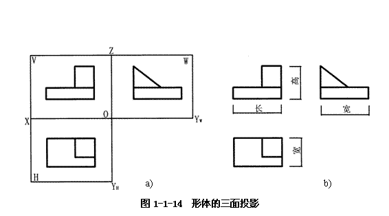 將物體放置于三面投影體系中,并注意安放位置適宜,即把物體的主要表面與三個(gè)投影面對(duì)應(yīng)平行,然后用三組分別垂直于三個(gè)投影面的平行投射線進(jìn)行投影,即可得到三個(gè)方向的正投影圖,如圖1-1-13所示。從上向下投影,在H面上得到水平投影面,簡稱水平投影或H投影;從前向后投影,在V面得到正面投影圖,簡稱正面投影或V投影;從左向右投影,在W面上得到側(cè)面投影圖,簡稱側(cè)面投影或W投影。