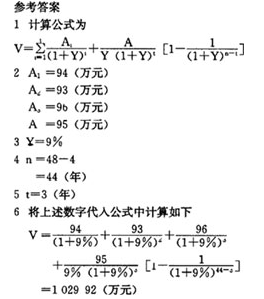 采用假開發(fā)法估價。預(yù)計項目在完工時可全部售出,投資利潤率取20%,季度利率為1.665%。設(shè)項目在1998年1月1日價格為V,估算如下:
