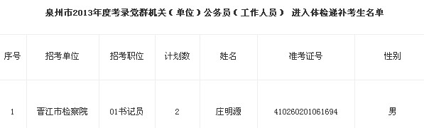2013年泉州市黨群機(jī)關(guān)公務(wù)員體檢遞補(bǔ)名單