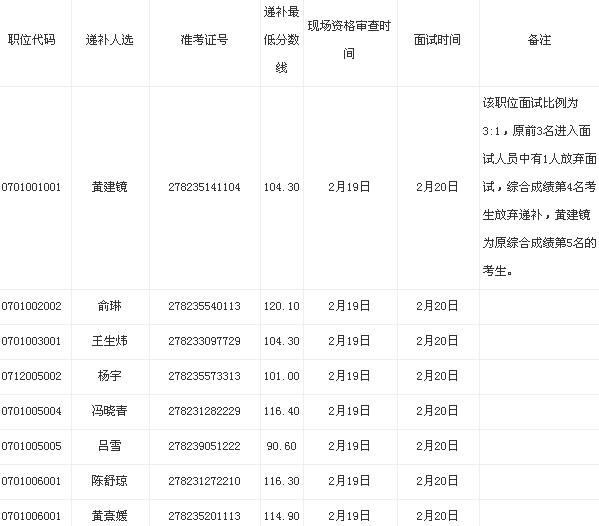 由于部分考生自愿放棄面試資格或經(jīng)資格預(yù)審不符合報考條件,根據(jù)中央機關(guān)及其直屬機構(gòu)公務(wù)員考試錄用有關(guān)規(guī)定,在公共科目筆試合格的考生中,按照筆試成績從高到低的順序,遞補以下考生為面試人選: