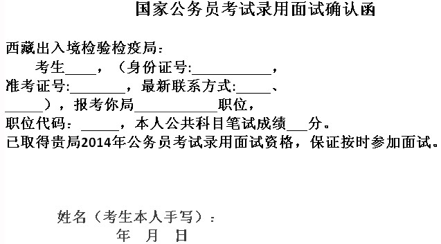 郵件確認:請?zhí)顚憽秶?a style='color:blue;' href='/leraning/class_gwy/' target='_blank'>公務(wù)員考試錄用面試確認函》(見附件1)并發(fā)送郵件至gongjoz@xzciq.gov.cn、cidwj@126.com。