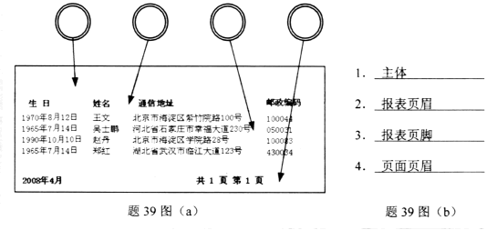 39.分析圖(a)中通訊錄報(bào)表的結(jié)構(gòu),將圖(b)給出的報(bào)表節(jié)名稱所對(duì)應(yīng)的編號(hào)填入圖(a)相應(yīng)的雙線圓中,表明通訊錄報(bào)表每個(gè)組成部分在設(shè)計(jì)視圖中的名稱。