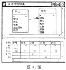 41.有學(xué)生和體檢兩個(gè)表,如下圖所示。若要建立一個(gè)查詢,顯示體檢中“心肺”或“肝脾”檢查結(jié)果是“異常’’的學(xué)生的學(xué)號(hào)、姓名、心肺、肝脾和班級(jí)名稱,并要求按學(xué)號(hào)“升序”排列輸出。
