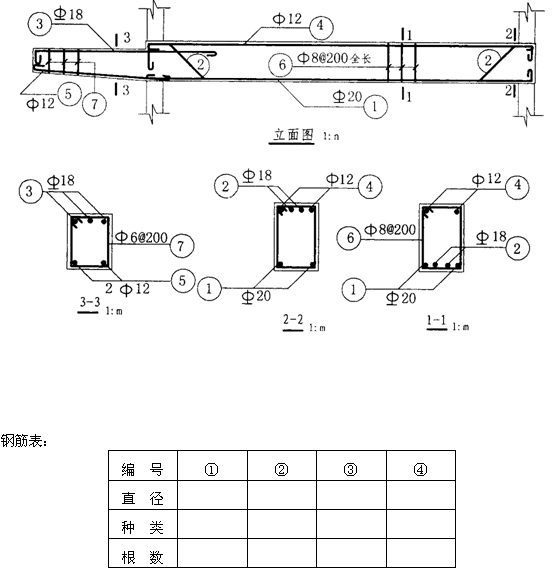 十一、根據(jù)鋼筋混凝土梁的結(jié)構(gòu)圖,填寫鋼筋表。(本大題12分)