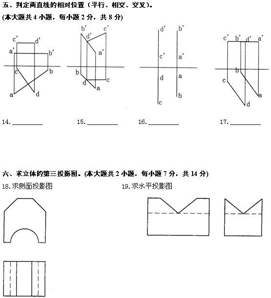 九、求作三棱柱與圓柱相貫線的側(cè)面投影。(本大題10分)