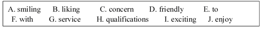 Cabin attendants make face-to-face contact 26 passengers.Cabin attendants should possess essential 27 for their work.The quality of the cabin 28 is judged on the friendliness,courtesy and appearance of the cabin attendants.They should 29 their work.They are doing an 30 and challenging job.They should be 31 and helpful 32 passengers.They must keep 33 during their work. A warm 34 for other people is a necessary qualification for passenger service work. Dignity, warmth and a sincere 35 for people are the best qualities.