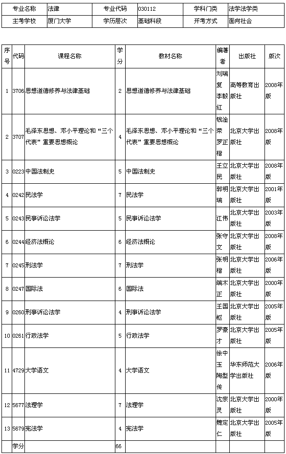 福建省2013年廈門大學自考法律(基礎(chǔ)科段)考試計劃