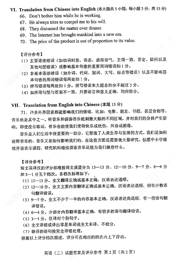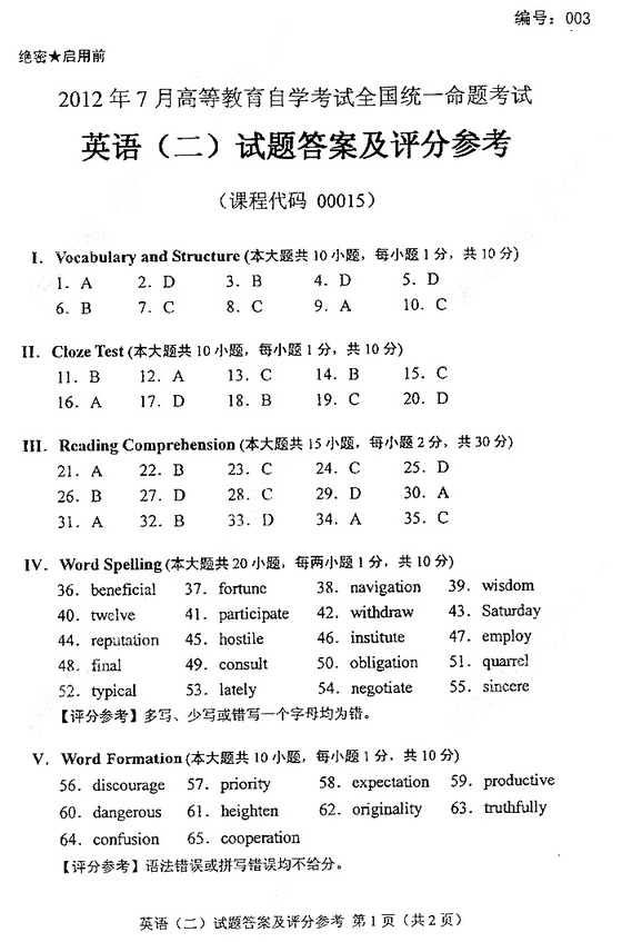 全國(guó)2012年7月自考英語(yǔ)(二)參考答案