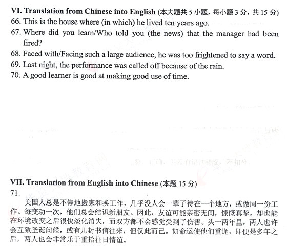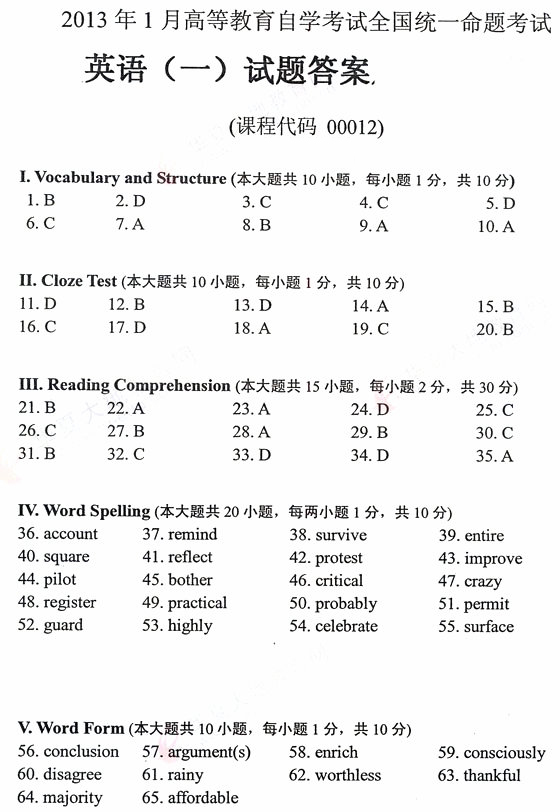 全國(guó)2013年1月自考英語(yǔ)(一)參考答案