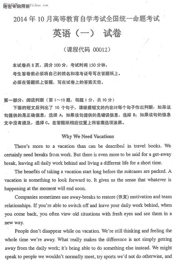 摘要 全國2014年10月自考英語(一)真題,由環(huán)球網(wǎng)校自考頻道為您整理發(fā)布!