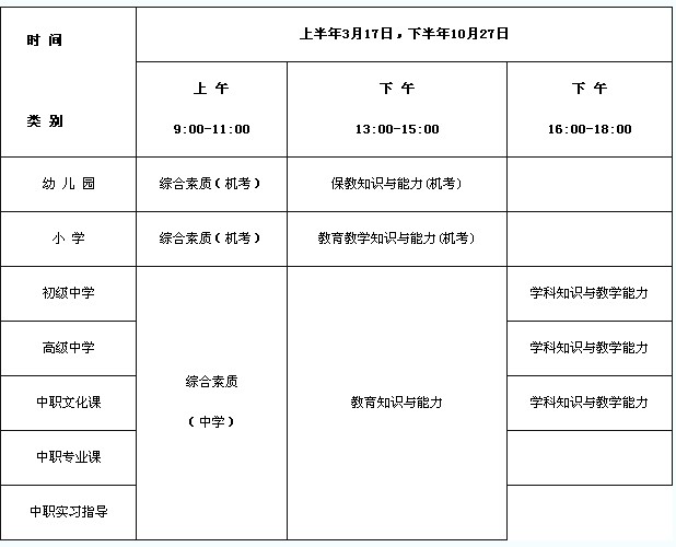 (二)考試時(shí)間:上半年3月17日。下半年10月27日。上午9:00?11:00教育學(xué);下午2:00?4:00心理學(xué)。