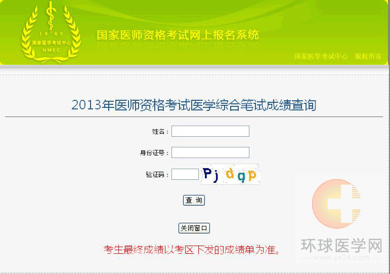 2013年臨床執(zhí)業(yè)醫(yī)師資格考試醫(yī)學綜合筆試成績已經(jīng)出來了,還未查成績的考生可以登錄國家醫(yī)學考試網(wǎng)(http://www.nmec.org.cn/)或者點擊下面圖片鏈接進行成績查詢。
