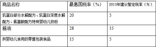 為積極增加進口,滿足國內(nèi)經(jīng)濟社會發(fā)展及消費需求,2013年我國將對780多種進口商品實施低于最惠國稅率的年度進口暫定稅率。其中,新增和進一步降低稅率的產(chǎn)品主要分為五大類,一是調(diào)味品、特殊配方嬰幼兒奶粉、心臟起搏器、血管支架等促進消費和改善民生,與人民群眾密切相關的生活和醫(yī)療用品;二是汽車生產(chǎn)線機器人、寬幅噴墨打印機、有機發(fā)光二極管顯示屏、電動汽車用逆變器模塊、鋰電子蓄電池、無級變速箱用鋼帶等促進裝備制造業(yè)和戰(zhàn)略性新興產(chǎn)業(yè)發(fā)展的設備、零部件和原材料;三是高嶺土、云母片、鎢鐵、銻等能源資源性產(chǎn)品,以及船舶壓載水處理設備用過濾器、動車組用膠囊等有利于節(jié)能減排的環(huán)保產(chǎn)品;四是紫苜蓿、奶襯、自走式飼料攪拌投喂車等支農(nóng)惠農(nóng)產(chǎn)品;五是羽絨、亞麻短纖、全自動轉(zhuǎn)杯紡紗機等支持紡織行業(yè)發(fā)展的產(chǎn)品。