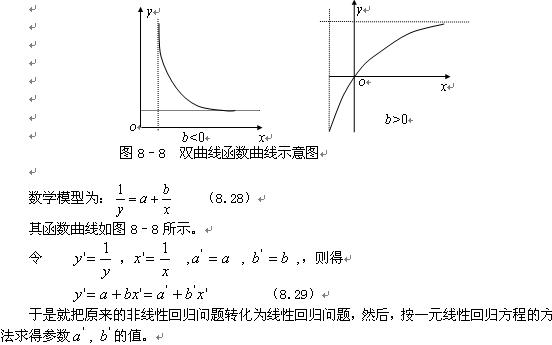 回歸模型的因變量y與自變量x之間的關(guān)系都不是線性的。但對于有些因變量y對自變量x的曲線關(guān)系情形,我們往往可以通過變量代換的方式把他們轉(zhuǎn)換成線性的形式。具體思路是通過作散點圖或定性分析判定出兩個變量之間存在的相關(guān)關(guān)系為曲線相關(guān)時,可先根據(jù)變量間不同類型配合一條與其相適應(yīng)的回歸曲線,如指數(shù)曲線、雙曲線等,然后再確定回歸方程中的未知參數(shù)。對于那些可線性化的回歸方程,對新變量而言,線性化后的方程都為直線方程,故其參數(shù)的確定可用線性回歸方程求參數(shù)的公式計算。下面給出幾種常見的非線性模型及其線性化方法。