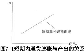 在圖7—1中,縱軸表示通貨膨脹率,橫軸表示經(jīng)濟增長率(G)和就業(yè)率(N),坐標中斜率為正的曲線表示經(jīng)濟增長率與通貨膨脹率之間的正相關(guān)關(guān)系,亦即產(chǎn)出水平與價格水平的正相關(guān)關(guān)系。由于就業(yè)率與經(jīng)濟增長率是正相關(guān)的,因此,坐標中的曲線也表示就業(yè)率與通貨膨脹率之間的正相關(guān)關(guān)系。如果我們把圖7—1坐標的橫軸表示為失業(yè)率,就會得到一條斜率為負的曲線,這條斜率為負的曲線就是我們在第五章中給出的短期菲利普斯曲線。短期菲利普斯曲線所表示的是失業(yè)率與通貨膨脹率之間的負相關(guān)關(guān)系。由于圖7—1中斜率為正的曲線與第五章中的圖5—2中斜率為負的曲線所表示的意思相同,因此,圖7—1中斜率為正的曲線也稱為短期菲利普斯曲線。