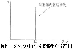 在圖7—2的坐標中,縱軸表示通貨膨脹率,橫軸表示失業(yè)率,坐標中垂直于橫軸的垂線被稱為長期菲利普斯曲線。垂直的長期菲利普斯曲線表明,在長期中,無論價格水平怎樣變動,失業(yè)率均為自然失業(yè)率( )不變,如第三章和第五章所述,在只存在自然失業(yè)率的條件下即實現(xiàn)了充分就業(yè)的條件下所實現(xiàn)的產(chǎn)出水平實際上就是潛在的產(chǎn)出水平。因此,圖7—2中的垂線不僅意味著自然失業(yè)率或充分就業(yè)的就業(yè)率與價格水平無關(guān),也意味著潛在產(chǎn)出水平與價格水平無關(guān)。在長期中,潛在產(chǎn)出與價格水平之所以無關(guān),是因為潛在產(chǎn)出水平取決于生產(chǎn)要素的投入數(shù)量和生產(chǎn)要素的效率,而不是取決于價格水平。