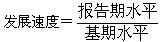 發(fā)展速度是以相對數(shù)形式表示的兩個(gè)不同時(shí)期發(fā)展水平的比值,表明報(bào)告期水平已發(fā)展到基期水平的幾分之幾或若干倍。計(jì)算公式為:轉(zhuǎn)自環(huán) 球 網(wǎng) 校edu24ol.com