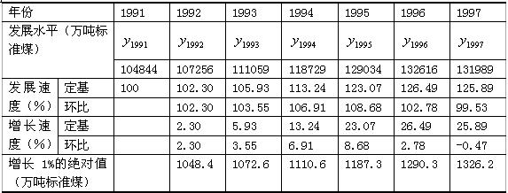 例9 我國(guó)1991-1997年能源生產(chǎn)量列于表3-12,根據(jù)這些資料計(jì)算的發(fā)展速度、增長(zhǎng)速度及增長(zhǎng)1%的絕對(duì)值也列于該表中。