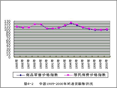 由數(shù)據(jù)可見,1985-2000年間,中國物價指數(shù)的變化以1998年為界可以分為兩個階段。此前物價指數(shù)為正,說明一直存在不同程度的通貨膨脹;此后物價水平下降,說明處于通貨緊縮狀態(tài)。在1985-1988年間,有兩個通貨膨脹的高峰期,即1988-1989年和1993-1995年,其幅度在一定程度上已具備了上述飛奔的通貨膨脹的特征。
