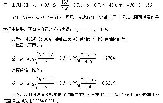 例9 為調(diào)查某市80000戶年收入在10萬元以上家庭擁有小轎車的比例,隨機抽取了450戶,結(jié)果表明有135戶以上家庭擁有小轎車,試以95%的把握程度推斷該市年收入在10萬元以上家庭擁有小轎車的比例的置信區(qū)間。