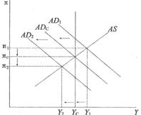 在圖7―4的坐標(biāo)中,縱軸為通貨膨脹率,橫軸為產(chǎn)出水平。坐標(biāo)中的垂線代表潛在產(chǎn)出水平,AS線為短期總供給曲線,AD線為總需求曲線。假設(shè)總供給為AS線不變,經(jīng)濟中最初的總需求曲線為AD1線,這時的產(chǎn)出水平為Y1,高于潛在產(chǎn)出水平Y(jié)c,通貨膨脹率較高為 ,說明這時的經(jīng)濟在高點運行,資源被過度利用,經(jīng)濟出現(xiàn)過熱。政府為了抑制通貨膨脹,采用緊縮性財政政策和緊縮性貨幣政策,減少了總需求,使總需求曲線從AD1線左移到ADc線,這時的通貨膨脹率就會從 下降到 ,但是產(chǎn)出水平也相應(yīng)下降到Y(jié)c的水平。通常,當(dāng)產(chǎn)出水平達到Y(jié)c時,在經(jīng)濟社會中也就實現(xiàn)了充分就業(yè),假如這時的通貨膨脹率 是可以接受的,那么也就意味著政府所追求的政策目標(biāo)實現(xiàn)了。如果認為 的通貨膨脹率是不能容忍的,政府就會繼續(xù)減少總需求,使總需求曲線左移,當(dāng)總需求曲線移至AD2線時,通貨膨脹率會進一步下降到 ,但是產(chǎn)出水平則進一步下降到Y(jié)2。這時,由于實際產(chǎn)出水平低于潛在產(chǎn)出水平,經(jīng)濟中的實際失業(yè)率會高于自然失業(yè)率。由此可見,如果政府使用緊縮性財政政策和緊縮性貨幣政策壓縮總需求,就可以有效地抑制通貨膨脹,但也會使經(jīng)濟出現(xiàn)一次明顯的衰退過程。經(jīng)濟衰退不僅意味著產(chǎn)出水平的減少,也意味著失業(yè)的增加。