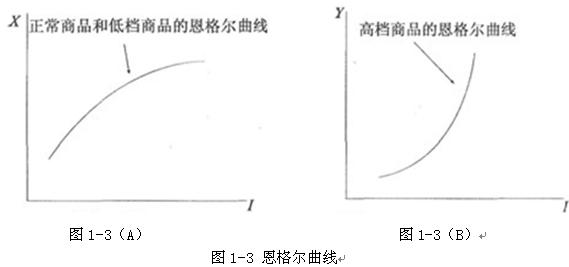 圖1-3(A)表明,消費者對正常商品和低檔商品的需求量的增加幅度需小于他們的收入增加的幅度,既每增加一個單位的可支配收入,消費者對正常商品和低檔商品消費的增加量是遞減的。圖1-3(B)表明,消費者對高檔商品需求量增加的幅度需大于他們收入增加的幅度,即每增加一個單位的可支配收入,消費者對高檔商品消費的增加量是遞增的。