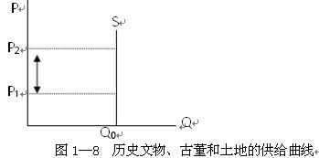 圖1—8表明,歷史文物、古董和土地的價(jià)格無(wú)論是上升至P2,還是下降到P1,其供給量都是不變的,都為Q0 。
