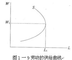 在生產(chǎn)要素市場(chǎng)上,勞動(dòng)的供給曲線在一定的價(jià)格水平即工資水平(W)上也可能成為供給法則的例外。一般認(rèn)為,勞動(dòng)的供給曲線是一條向后彎曲的曲線。如圖l一9所示。