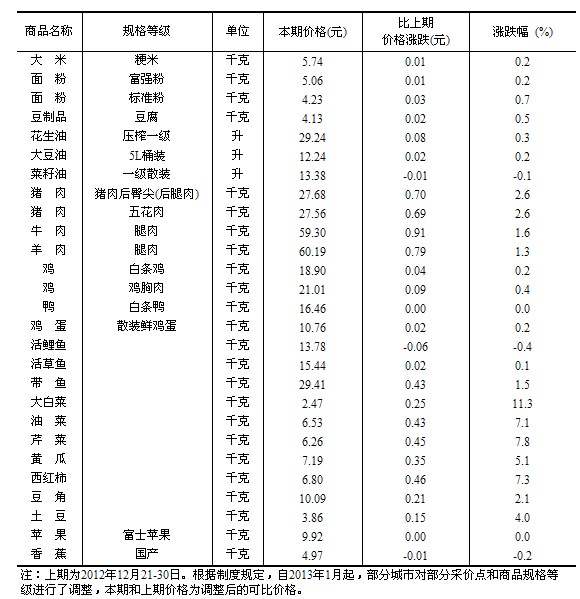 50個城市主要食品平均價格變動情況(2013年1月1-10日)