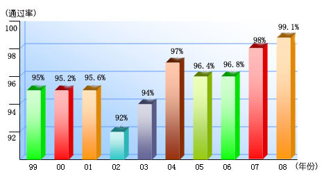 網(wǎng)校職稱英語(yǔ)輔導(dǎo)的通過(guò)率一直高居榜首。1999年、2000年、2001年均超過(guò)了95%。2002年雖然考試題型改變,難度有較大增加,但是輔導(dǎo)通過(guò)率仍達(dá)到了92%。而且在后面的幾年隨著經(jīng)驗(yàn)的豐富通過(guò)率也不斷上升,2008年通過(guò)率達(dá)到了99.1%。具體數(shù)據(jù)如下圖所示: