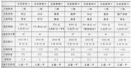 5.A市政府招待所與政府脫鉤,擬組建股份制公司繼續(xù)經(jīng)營,委托某土地評估機構(gòu)進行評估,用于辦理用地手續(xù),評估基準(zhǔn)日確定為2004年1月31日,評估人員確定采用基準(zhǔn)地價系數(shù)修正法和市場比較法作為評估的基本方法,確定宗地屬于商業(yè)用地二級區(qū),并在該招待所附近地區(qū)調(diào)查選取了7宗類似房地產(chǎn)的交易實例作為交易案例,請選擇三個交易案例作為比較實例并計算出該招待所宗地內(nèi)“七通一平”條件下的土地使用權(quán)價格。