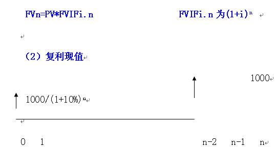 例如,將1000元存入銀行,年利率為10%,一年以后的復利終值為1000(1+10%);兩年以后的復利終值為1000(1+10%)(1+10%);三年以后的復利終值為1000(1+10%)(1+10%)(1+10%)……………n年以后的復利終值為1000(1+10%)ⁿ