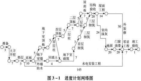 [背景] 某市一小學(xué)教學(xué)樓,建筑面積4682┫,地下一層,地上三層。工程結(jié)構(gòu):為框架剪力墻結(jié)構(gòu),其中地下全現(xiàn)澆;地上為框架結(jié)構(gòu),填充墻為加氣混凝土砌塊。建筑裝修:600×600地磚地面,頂棚和墻面刷乳膠漆,配套電氣工程。該工程進(jìn)度計(jì)劃見圖3-1,其中工序上邊的數(shù)字為該工序需要的日歷天數(shù)。環(huán)球環(huán)球網(wǎng)校網(wǎng)校