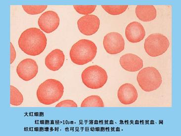 直徑大于10 μ m,見于溶血性貧血由于不全成熟的紅細胞增多)及巨幼紅細胞性貧血(是由于葉酸或維生素B12缺乏,DNA合成障礙,血紅蛋白合成過剩,脫核后形成大紅細胞或巨紅細胞)。