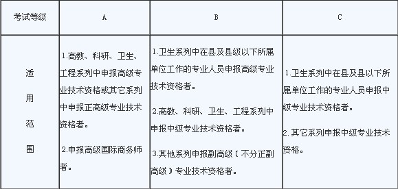 根據(jù)《關(guān)于調(diào)整完善我省職稱外語(yǔ)政策的通知》(粵人發(fā)〔2007〕120號(hào)),考試等級(jí)劃分及適用范圍如下: