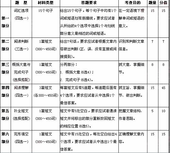 為達(dá)到上述目標(biāo),考試對(duì)應(yīng)試者的英語(yǔ)匯量、語(yǔ)法知識(shí)和閱讀理解能力分別提出如下要求: