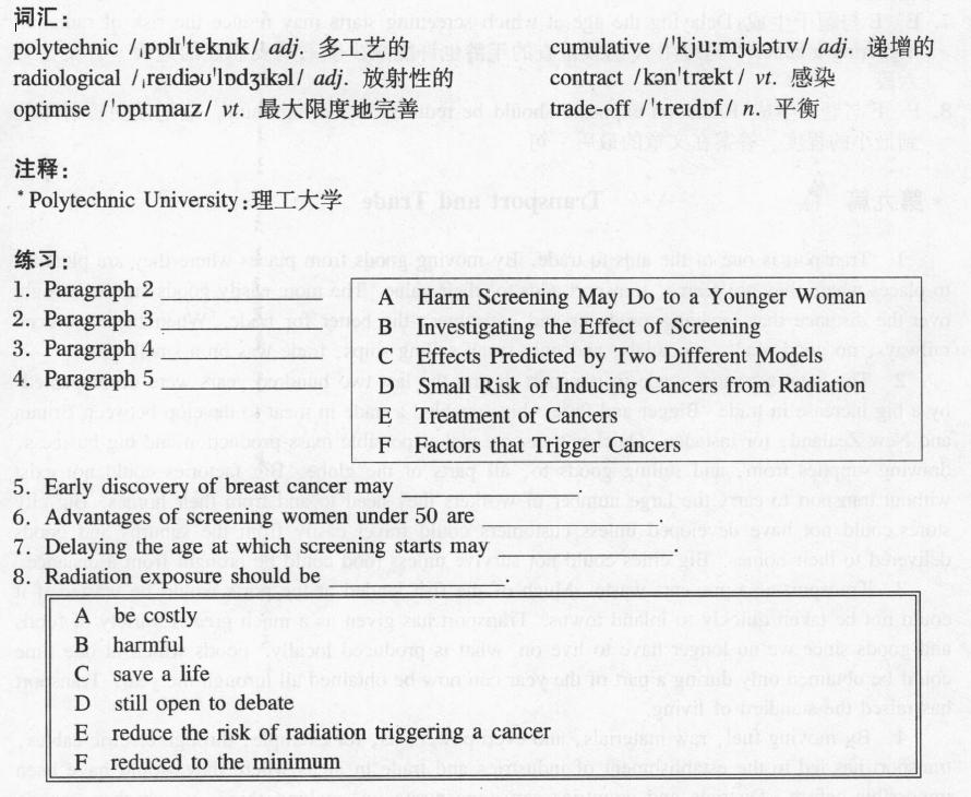 6.D D 與題干生成: Advantages of screening women under 50 are still open to debate .對(duì)50歲以下的女人用x射線檢查的好處仍然是有爭議的。第二段的第一個(gè)句子是這么說的: But the medical benefits of screening these younger women are controversial… 但是,用x射線檢年輕女性,就醫(yī)學(xué)上的好處而論,是有爭議的……這兩個(gè)句子用詞有些差別,但基本意思是相同的。