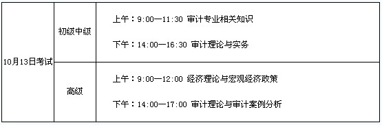 2013年度全國審計(jì)專業(yè)技術(shù)初、中、高級(jí)資格考試定于10月13日統(tǒng)一舉行,初、中級(jí)資格考試考點(diǎn)設(shè)在本市,高級(jí)資格考試考點(diǎn)設(shè)在省會(huì)石家莊。具體時(shí)間及科目如下: