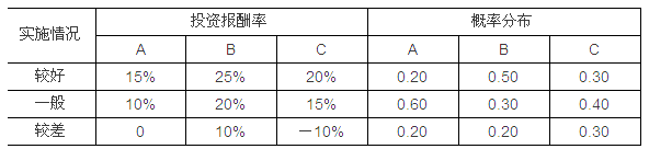 【答案解析】:A投資的期望報(bào)酬率=15%×0.20+10%×0.60+0×0.20=9%,B投資的期望報(bào)酬率=25%×0.50+20%×0.30+10%×0.20=20.5%,C投資的期望報(bào)酬率=20%×0.30+15%×0.40+(-10%)×0.30=9%。