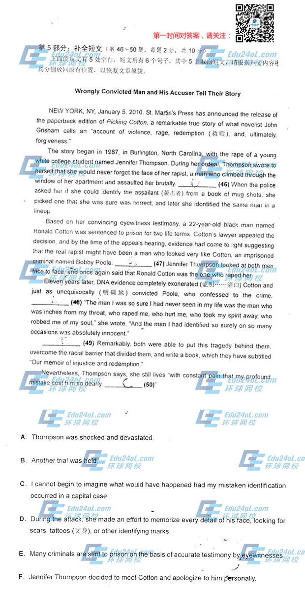 2014年職稱英語綜合類A級試題及答案:補全短文