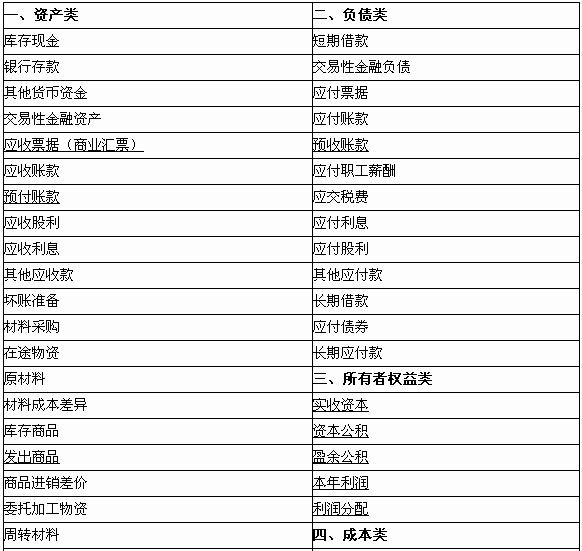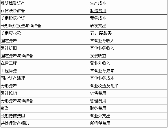 會(huì)計(jì)科目按其所歸屬的會(huì)計(jì)要素不同,一般分為資產(chǎn)類、負(fù)債類、所有者權(quán)益類、成本類、損益類等五大類,每一大類會(huì)計(jì)科目可按一定標(biāo)準(zhǔn)再分為各個(gè)具體科目。
